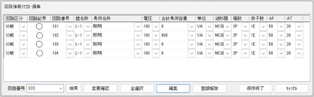 回路区分、回路記号、回路番号、盤名称、負荷名称、電圧、合計負荷容量、単位、遮断器、極数、素子数、AF、ATの設定が表示されます。クリックして変更することもできます。 |