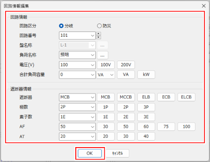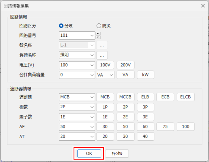 選択している行の回路情報が[回路情報編集]ダイアログに表示され、回路情報を編集できます。 [回路情報][遮断器情報]を入力し、[OK]ボタンをクリックします。