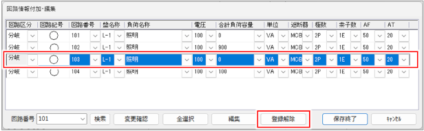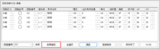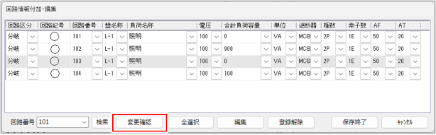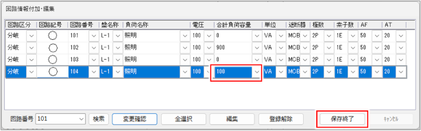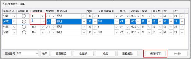 [回路番号]列で回路番号を変更し、[保存終了]ボタンをクリックします。
