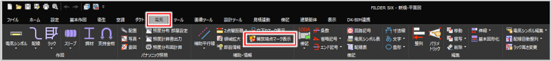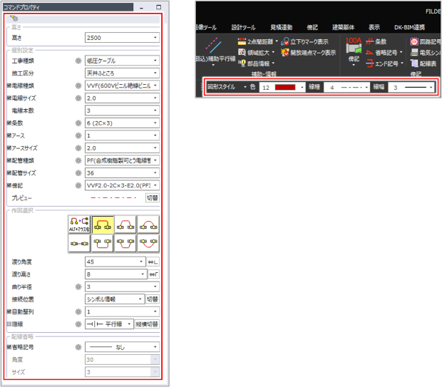 FILDER SiXには、あらかじめ多数の電線・電線管の種類が登録されており、作図の際に[コマンドプロパティ]から電線・電線管の種類や本数などを選択できます。傍記も自動で配置されます。