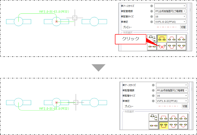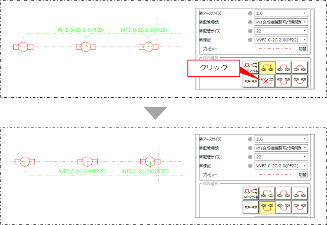 条数・アース記号の設定をプレビューで表示します。 [切替]ボタンをクリックするとプレビューのパターンが切り替わります。[電線種類]で[電線なし]を選択した場合は、空配管のマークを選択できます。 |
