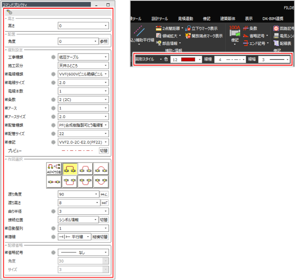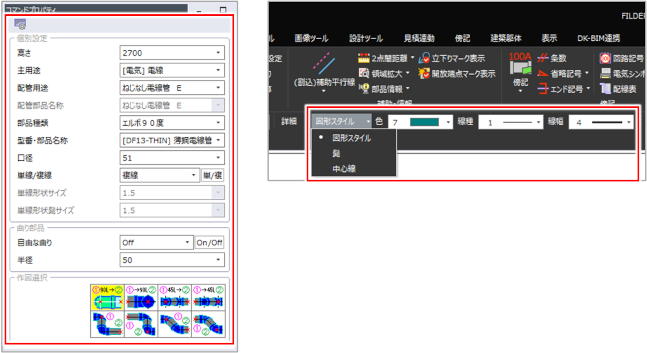 [コマンドプロパティ]で作図する電線管の情報を設定し、[図形スタイル]ツールバーで電線管の色・線種・線幅を設定します。