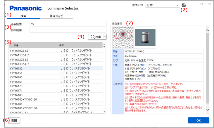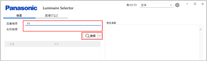 [品番検索]や[名称検索]に、検索する照明器具の品番・名称を入力し(一部でも可)、[検索]ボタンをクリックします。
