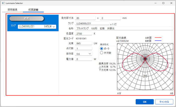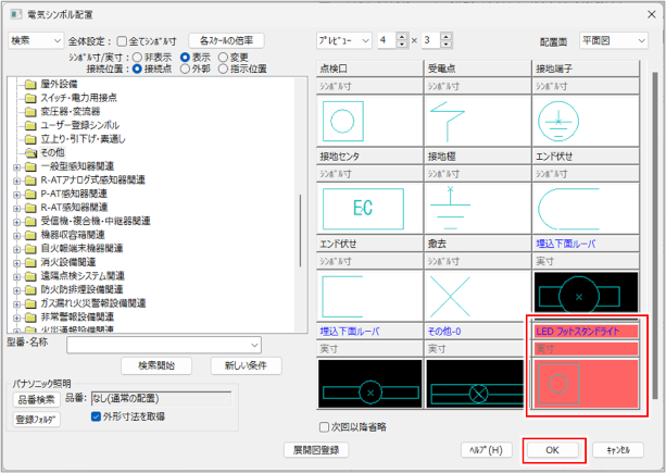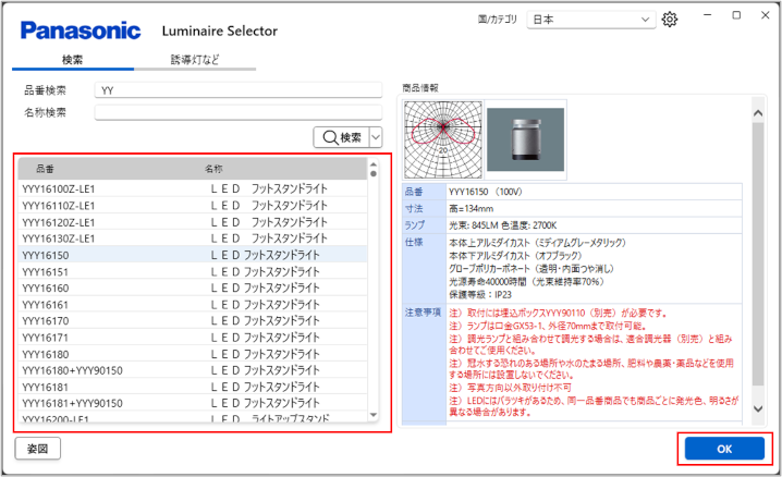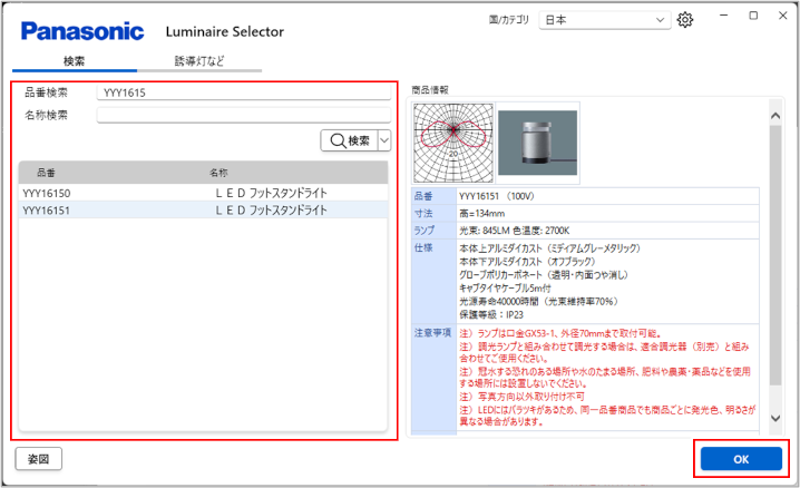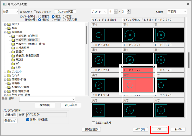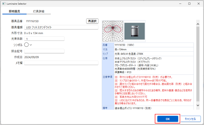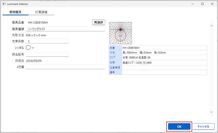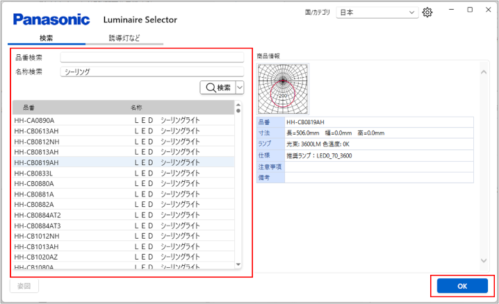 検索結果一覧から配置する照明器具を選択し、[OK]ボタンをクリックします。