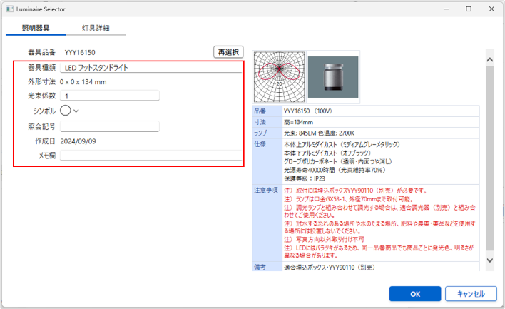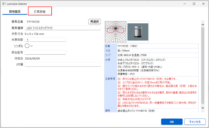検索結果一覧で選択した照明器具の情報が表示されます。 |