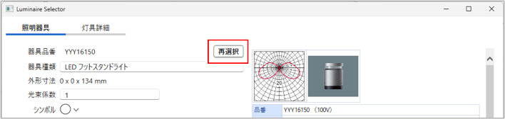 検索結果一覧で選択した照明器具の姿図を表示します。 |