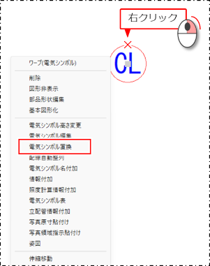 図面上で置き換える電気シンボルを右クリックし、[電気シンボル置換]をクリックします。