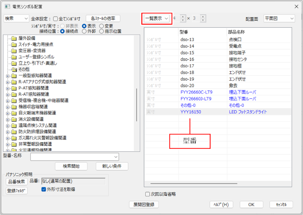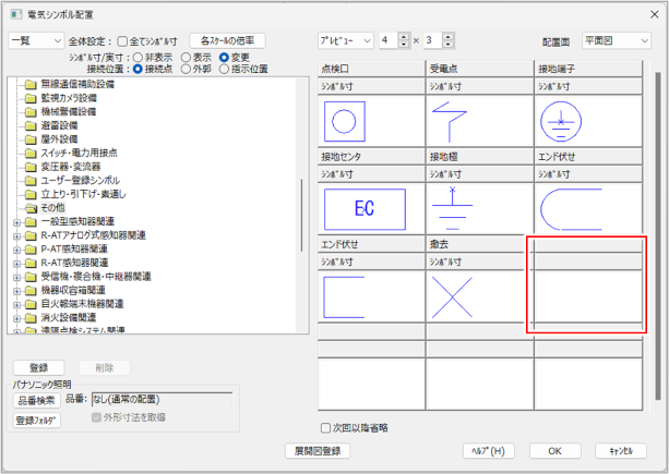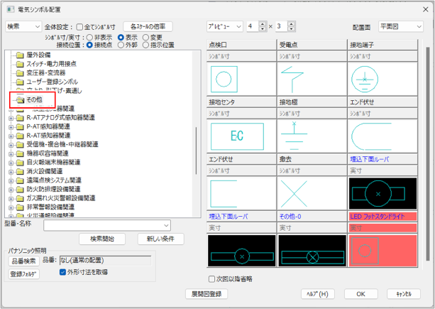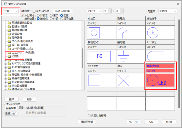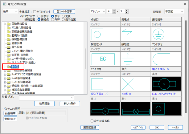 配置したパナソニック社の照明器具は、[電気シンボル配置]ダイアログの[その他]フォルダに登録されます。