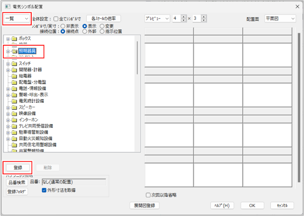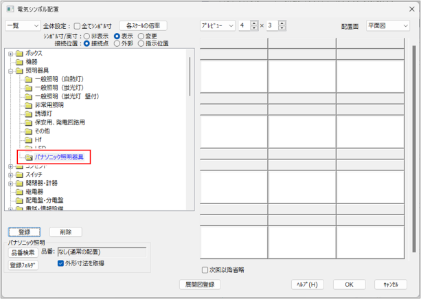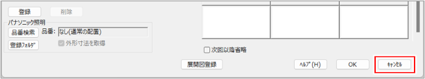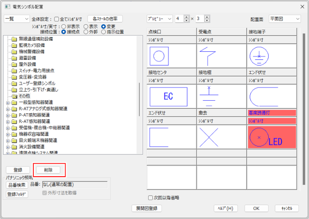 [電気シンボル配置]ダイアログに登録したパナソニック社の照明器具を削除できます。