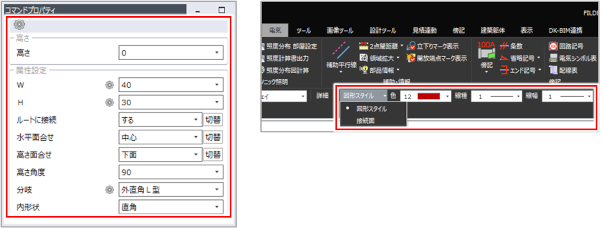 [コマンドプロパティ]で作図するレースウェイなどの情報を設定し、[図面スタイル]ツールバーでレースウェイなどの色・線種・線幅を設定します。