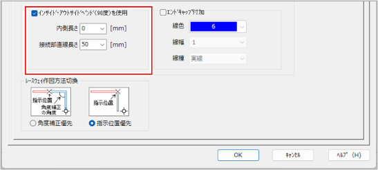 高さを変える場合の角度を選択します。[任意角]の場合は、クリック位置に応じた角度になります。 インサイド・アウトサイドベンドを使用する場合は、[90]を選択してください。なお、インサイド・アウトサイドベンドを使用するには、事前に[設定]タブ>[電気設定]>[レースウェイ][ダクト]>[基本]で[インサイド・アウトサイドベンド(90度)を使用]を設定してください。バスダクトにはこの機能はありません。