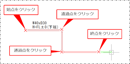 レースウェイ、ケーブルダクト、バスダクトの始点、通過点、終点をクリックします。