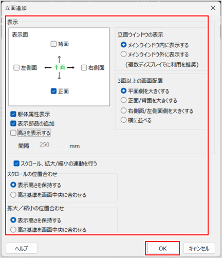 立面図の表示面やレイアウトなどを設定し、[OK]ボタンをクリックします。