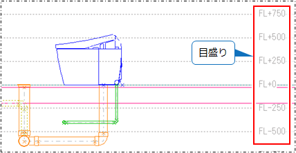 立面図に高さの目盛りを表示する場合は、チェックを付けて[間隔]に目盛り間隔を入力します。