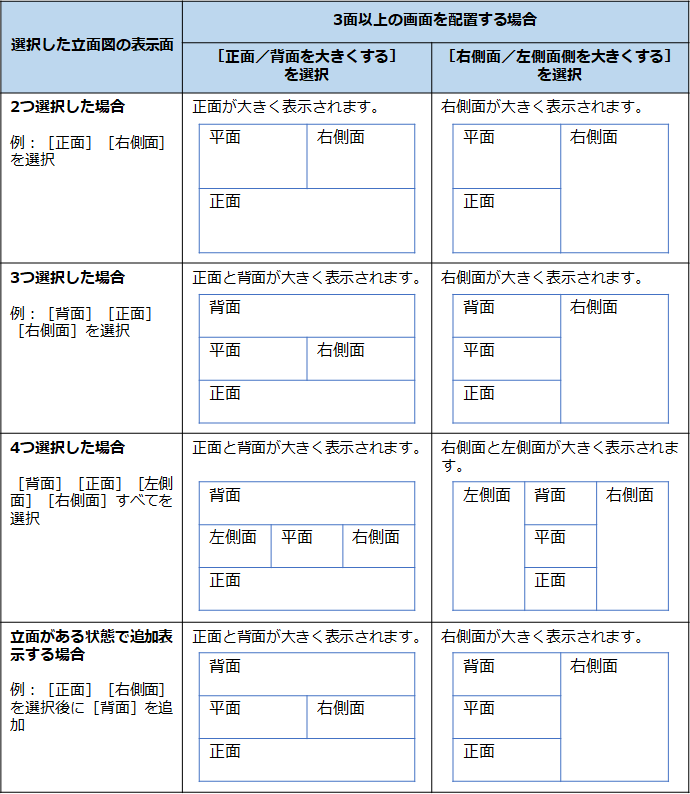 [表示面]で2つ以上の立面図を選択し、平面図と合わせて3つ以上のウィンドウを表示する場合、どのウィンドウを大きくするかを選択します。同じ大きさで横に並べる場合は、[横に並べる]を選択します。