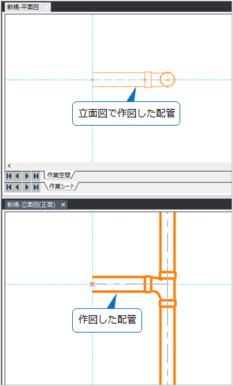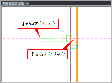 立面図上で点線と配管の中心線との交点をクリックし、作図する配管の終点をクリックします。