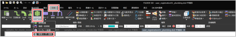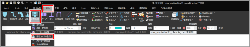 [衛生]タブ>[部材配置]プルダウンメニュー>[配管ユーザー登録] [空調]タブ>[部材配置]プルダウンメニュー>[配管ユーザー登録] |