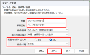 [配管ユーザー登録]ダイアログ(ファイル名、名称、種類等の登録)が表示されます。