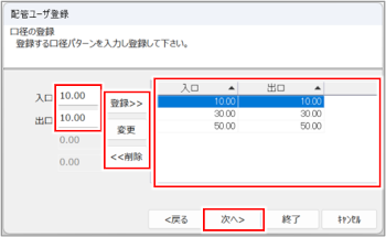 - [入口][出口]に口径を入力して[登録]ボタンをクリックすると、入力した値の組み合わせが口径パターンとして一覧に登録されます。