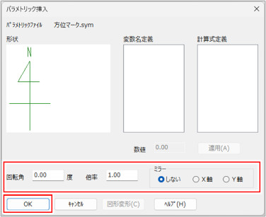 図形の倍率を入力します。 配置時に倍率を変えることもできます。 |