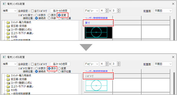 ユーザー登録した電気シンボルは実寸で配置する設定になっています。シンボル寸で配置したい場合は、設定を変更します。 1. [シンボル寸/実寸]で[変更]を選択して[実寸]部分をクリックすると、[シンボル寸]に変わります。 2. [シンボル寸/実寸]で[表示]を選択し、編集モードを終了させます。