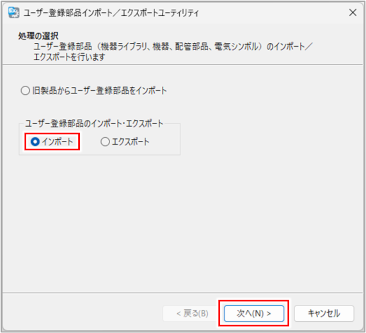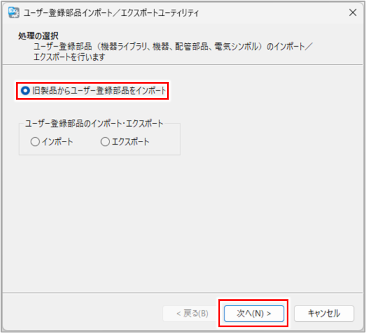 MasterUtilityを起動して、[旧製品からユーザー登録部品をインポート]を選択し、[次へ]ボタンをクリックします。