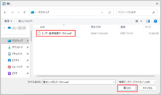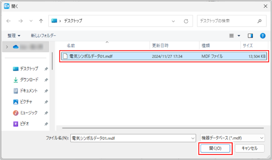 インポートするファイル(*.mdf)を選択し、[開く]ボタンをクリックします。