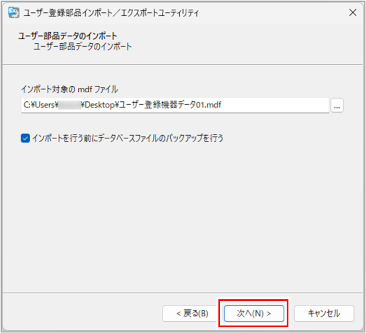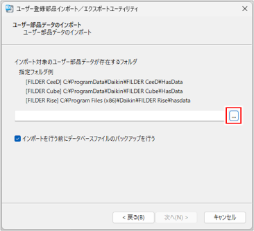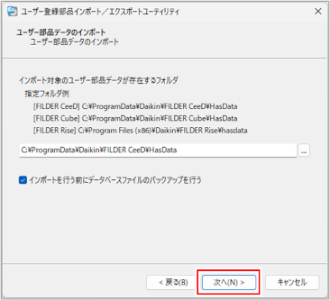 ユーザー登録している機器・配管部品・電気シンボルのバックアップファイルを保存する場合は、[インポートを行う前にデータベースファイルのバックアップを行う]にチェックを付けます。