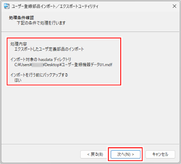 [ユーザー登録部品インポート/エクスポートユーティリティ]ダイアログ(処理条件確認)が表示されます。