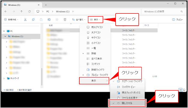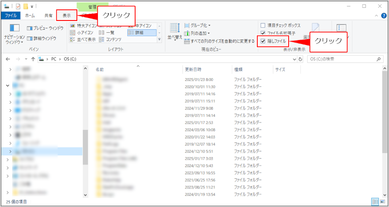作業前にインポートするデータが格納されている「ProgramData」フォルダ(隠しフォルダ)を表示しておく必要があります。パソコンの設定を確認し、隠しフォルダを表示する設定にします。ただし、隠しフォルダや隠しファイルを誤って削除・変更するとパソコンに重大な影響を与える可能性があるので、作業後は非表示に戻してください。