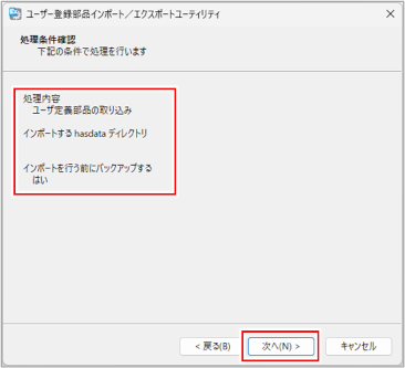 処理内容を確認し、[次へ]ボタンをクリックします。