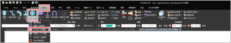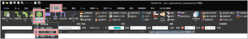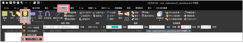 [衛生]タブ>[部材配置]プルダウンメニュー>[テンプレート配置] [空調]タブ>[部材配置]プルダウンメニュー>[テンプレート配置] [ダクト]タブ>[器具]プルダウンメニュー>[テンプレート配置] |