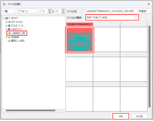 [ファイルの種類]で[DXFファイル(*.dxf)]を選択して、画面左のツリーより3D DXFファイルが含まれるフォルダをクリックし、目的のデータを選択します。