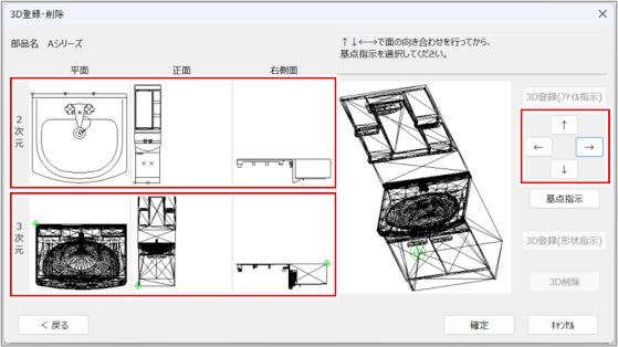 [2次元]と[3次元]の形状の各面を比べ、向きが一致していない場合は、[↑][↓][←][→]ボタンをクリックし、[3次元]の面の向きを[2次元]に合わせます。