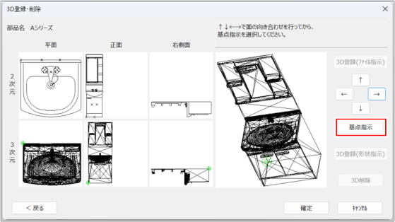 [2次元]と[3次元]の基点の位置がずれている場合は、[基点指示]ボタンをクリックして基点を変更します。