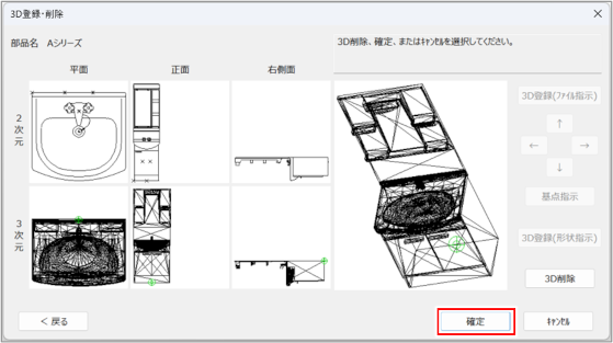 3Dデータが読み込まれ、[3D登録・削除]ダイアログが表示されます。3Dデータの形状が対応する欄に表示されます。