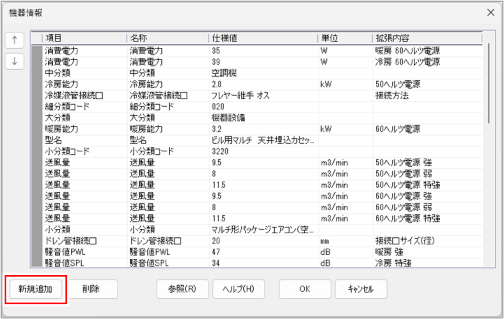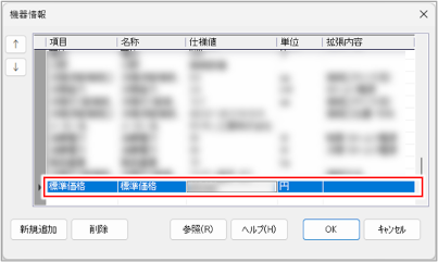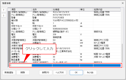 機器情報の項目行を新規追加する場合にクリックします。 |
