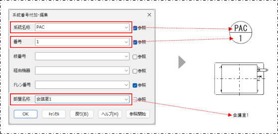 [系統番号付加・編集]コマンドで登録した内容を使用し、系統番号や部屋名称を図面に配置します。