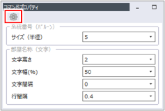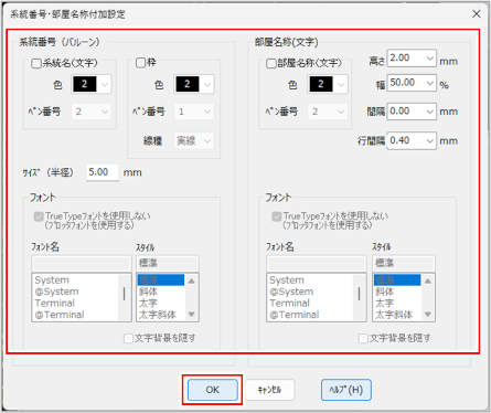 文字色・ペン番号などを詳細に設定する場合にクリックします。 クリックすると、[系統番号・部屋名称付加設定]ダイアログが表示されます。 |
