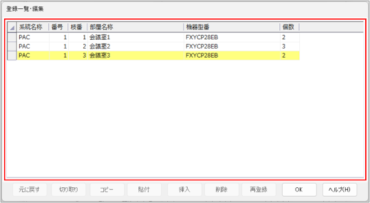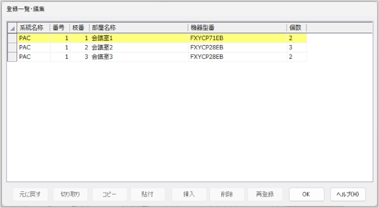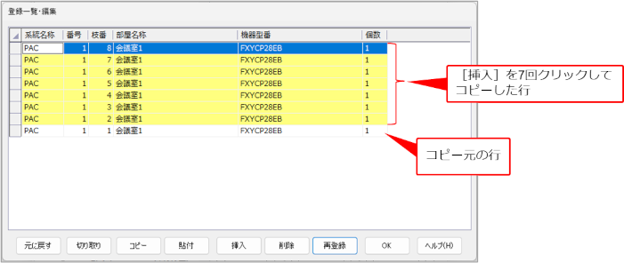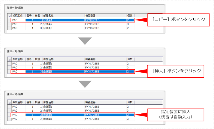 コピーまたは切り取った行を、挿入して貼り付ける場合にクリックします。 コピーの場合は、機器情報の重複を防ぐために枝番が自動入力されます。
