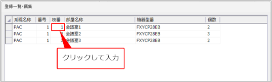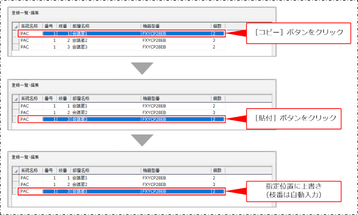 コピーまたは切り取った行を、上書きで貼り付ける場合にクリックします。 コピーの場合は、機器情報の重複を防ぐために枝番が自動入力されます。 |