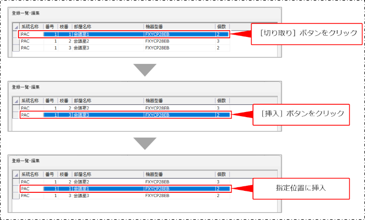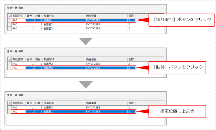 - 行を選択して[コピー]ボタンをクリックし、コピー先の行で[貼付]ボタンをクリックすると、上書きコピーされます。