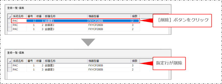 削除する行を選択して[削除]ボタンをクリックすると、行が削除されます。