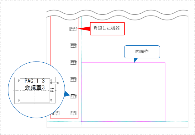 [機器登録]コマンドが終了し、図面枠外に再登録した機器が配置されます。