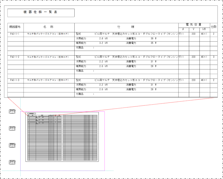 [機器表設定]がデフォルトの場合は、機器表を配置するための枠が表示されます。
