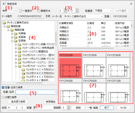 (7)のファイル表示方法を選択します。 [一覧表示]と[簡易形状]にチェックを付けていない場合は、型番と機器のプレビューが表示されます。