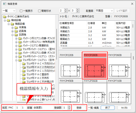 機器の型番や名称を検索し、機器表に機器を登録します。機器の登録と同時に、系統番号や部屋名称の登録も行うことができます。