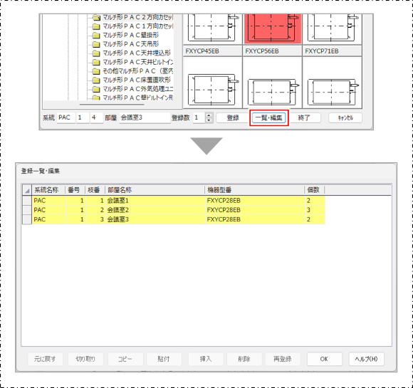 機器表に機器情報(系統、部屋、登録数)を登録する場合にクリックします。 |