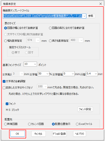 機器表を自動作成するときの書式や文字サイズを設定します。