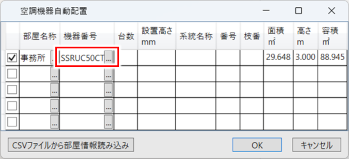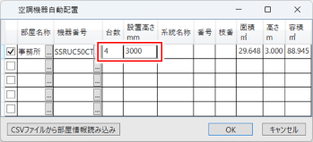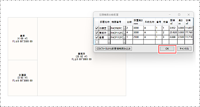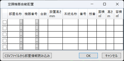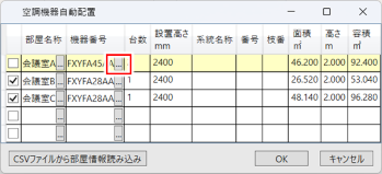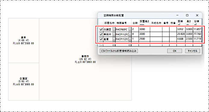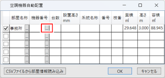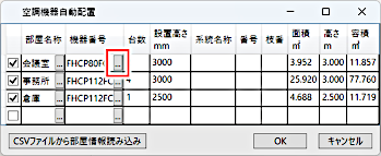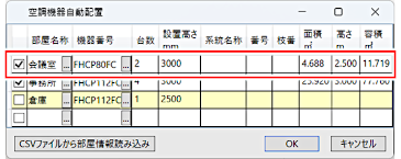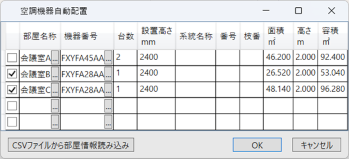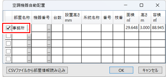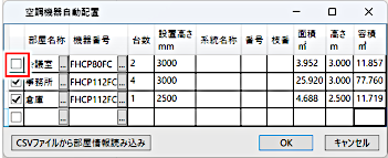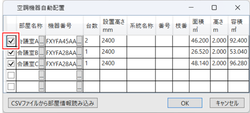 チェックボックスが有効の行のみ空調機器自動配置を実行します。